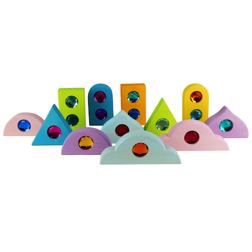 Eintauchen in eine zauberhafte Welt mit den Bauspiel Funkeldächern. Die zwölf kleinen Dächer in sechs unterschiedlichen Formen setzen dem Spielen mit Bauklötzen die Krone auf, aber im positiven Sinne, indem sie für noch mehr Freude und Variation sorgen. In den Dächern mit Holzrahmen sind bunte, transparente Funkelsteine aus Acryl eingelassen. So werden einfache Bauwerke im Handumdrehen zu Schlössern und Burgen. Die durchscheinenden Funkelsteine im Facettenschliff glitzern in der Sonne, was besonders für die Kleinsten faszinierend ist.