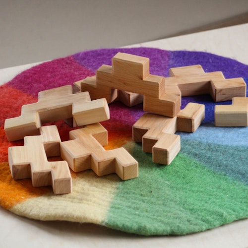 Bauspiel Baukästen aus naturbelassenem Holz mit kräftigen Farben und funkelnden Elementen ermöglichen unbegrenztes „open-ended“ Spiel und fördern Kreativität, Feinmotorik sowie ästhetisches Gestalten. Die modularen Bausteine lassen sich altersgerecht kombinieren und immer wieder neu arrangieren – für individuelle Spielwelten ganz nach Kinderfantasie.