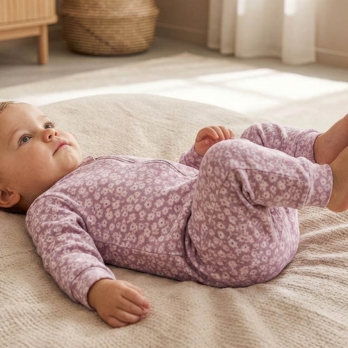 Bio Babystrampler mit detailverliebtem All-over-Print "Veilchen" in anschmiegsamer Rippe aus 100% Biobaumwolle aus biologisch-dynamischer Landwirtschaft von people wear organic.
