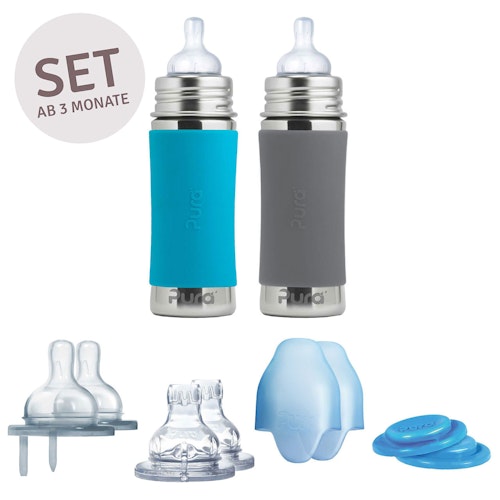 Unzerbrechliche Babyflaschen Set Edelstahl von Pura kiki mit jeweils 3 verschiedenen Saugern und Flaschendeckel - ab Geburt