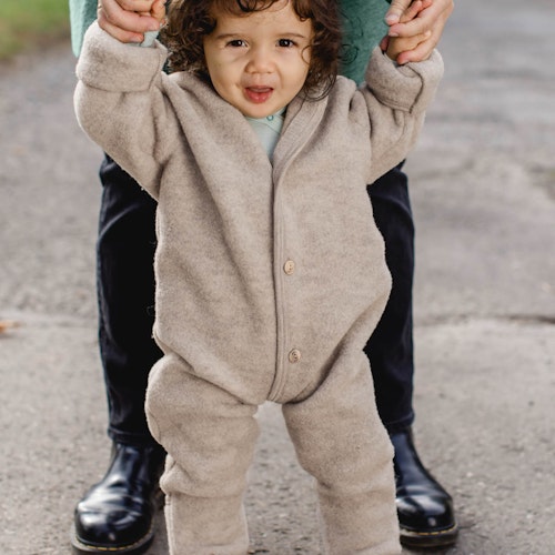 Außen schützt 100% Bio-Merino-Schurwolle (kbT) zuverlässig, während der Innenbereich mit einem traumhaft weichen Fleece die zarte Kinderhaut sanft umschmeichelt. Die Umschläge an Armen und Beinen bedecken Hände und Füße sanft, und wenn sie nicht genutzt werden, wachsen sie dank der mitwachsenden Passform einfach mit dem Kind mit.