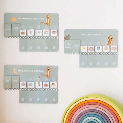 Mit Routinchen wird der Tagesablauf kinderleicht: Auf den Plänen lassen sich bedruckte Symbole für Zähneputzen, Anziehen, Frühstück & Co. individuell anordnen. Das in Österreich designte Set unterstützt Montessori-inspiriert die Selbstorganisation kleiner Entdecker und sorgt für entspanntes Miteinander.