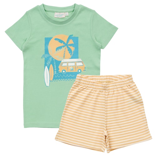 Der Schlafanzug besteht aus einem mintgrünen T-Shirt mit einem Druck, der eine Palme, ein Surfboard und einen Camper zeigt, sowie einer ocker-weiß gestreiften kurzen Hose.