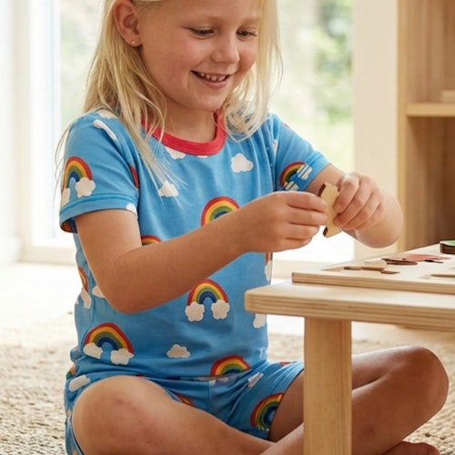 Sommerlicher Schlafanzug kurzam Regenbogen hellblau