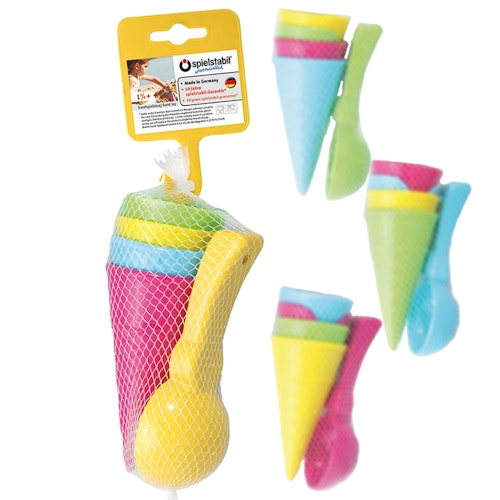 Die Eis-Saison im Sandkasten ist eröffnet - mit dem kunterbunten Eisförmchen-Set von Spielstabil! Vier Eistüten (zwei unterschiedliche Formgebungen) und ein Eisportionierer laden zum Füllen, Portionieren und Anbieten von „Sand-Eis“ ein. Der Portionierer formt kompakte Sandkugeln, die Tüten liegen gut in Kinderhänden. Kreative Rollenspiele rund um Eis-Bestellungen und Lieblingssorten entstehen ganz von selbst.